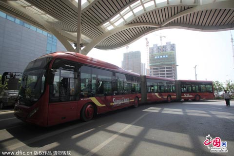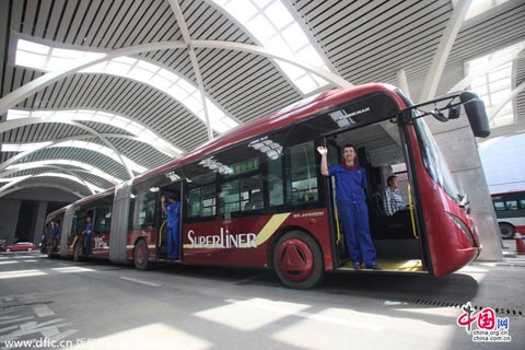 2014年5月21日,山东济南,在济南西客站公交苏牛公交枢纽,一辆25米长“巨无霸”公交车公交车现身。据了解,巨无霸公交车为全国首辆。这辆公交车将在济南停留1个月,近期将试跑济南的经十路。以济南目前越来越堵的交通状况,它能否敞开跑起来还是个未知数。共有3节车厢,5开门。