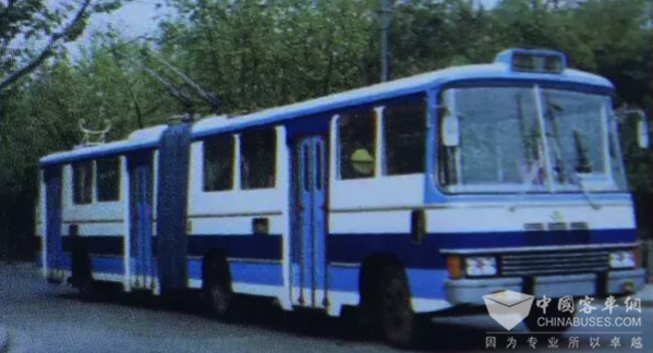 1983年SK--562G铰接式可控硅电车 随着城市交通的发展,上世纪60年代,上海引进了一批两节车厢的大容量铰接式公交车,车身长度是最初单机公交车的两倍,增加了车辆的乘客乘载量。
