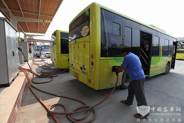 公交司机常健正在利用倒班的时间间隙给公交车补电