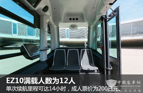 EZ10的满载人数为12人,其中6人享有座位,6人需要站立。EZ10单次续航里程可达14小时,巡航速度为20公里/小时,最高时速可达到40公里。EZ10将面向永旺梦乐城的顾客开放,成人单次票价为200日元(折合人民币13元),小学生(含以下)可享半价(折合人民币6.5元),未满两岁儿童免费乘坐。