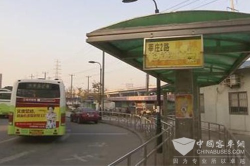 在康城小区北门的公交站台停靠着多辆莘庄2路公交车,而原本这里也是e乘巴士001路的停车站点,由于前天001路e乘巴士被该小区物业阻止入内,从昨天开始这条定制公交路线已暂停运营。