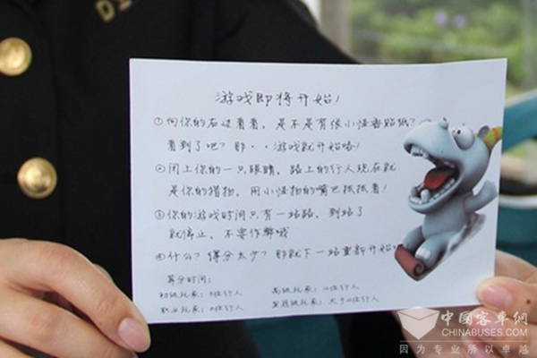 “从这些‘小怪兽’进入车厢的一天时间里,能明显看出,不少乘客对这个游戏感兴趣。当他们看到座位前方或手拉环上的游戏介绍后,都会选择放下手机,体验‘小怪兽’游戏带来的乐趣。”驾驶员张学昆说,游戏规则是:公交车车窗玻璃有张小怪兽贴纸,玩游戏的时候,乘客闭上一只眼睛,将路上的行人当做你的猎物,然后用“小怪兽”的大嘴巴咬猎物,咬到一人算一分,没咬到则扣掉一分。游戏时间为一站路,到站了就停止。最后根据总成绩定级别。