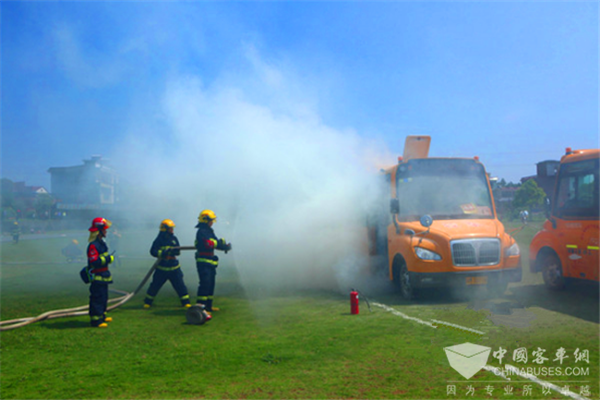 模拟场景中,校车在行驶途中与其他车辆发生碰撞,车头发生火情。驾驶员立即靠边停车,按下双闪灯、打开警示牌,防止二次事故发生,同时打开车辆应急开关,开启前门和应急逃生门,驾驶员在前,照管员在后,让学生们不要惊慌,用衣袖捂住口鼻从前后门撤离,紧急疏散乘车学生。乘车学生在随车照管员的带领下到达安全地带。随车照管员随即清点人数,查看受伤情况。期间,驾驶员迅速拿起灭火器进行自救,如火势太猛无法扑灭,拨打119、110等待支援。
