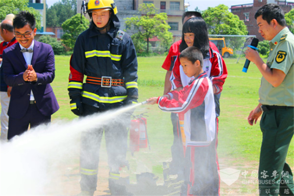 演练完毕后,消防大队教官组织消防安全知识培训,针对校车乘坐注意事项组织学生进行了实地操作演练,学会遇险时如何使用安全锤、灭火器等设施,提高规避风险和自我保护能力,并对驾驶员正确使用灭火器现场考核过关。