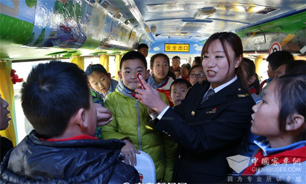 “安全是校车运行的第一要素,以流动的车厢为载体进行安全教育和交通法规宣传,一方面来能让学生更形象的了解相关知识,另一方面也呼呼社会更多的人关注校车安全,关注校车安全等相关法规,为了孩子们的健康成长,遵守法律法规,避让校车,礼让斑马线。”交运温馨校车公司常务副总经理于亮说,“将校车车厢手绘成一个浓缩的交通安全体验馆,让学生走进校车车厢就能看到人行道、红绿灯以及各种交通标志,在寓教于乐的氛围中学习交通法规,了解交通安全知识,进一步培养学生的法律意识和交通安全意识,为他们的健康安全成长保驾护航。”