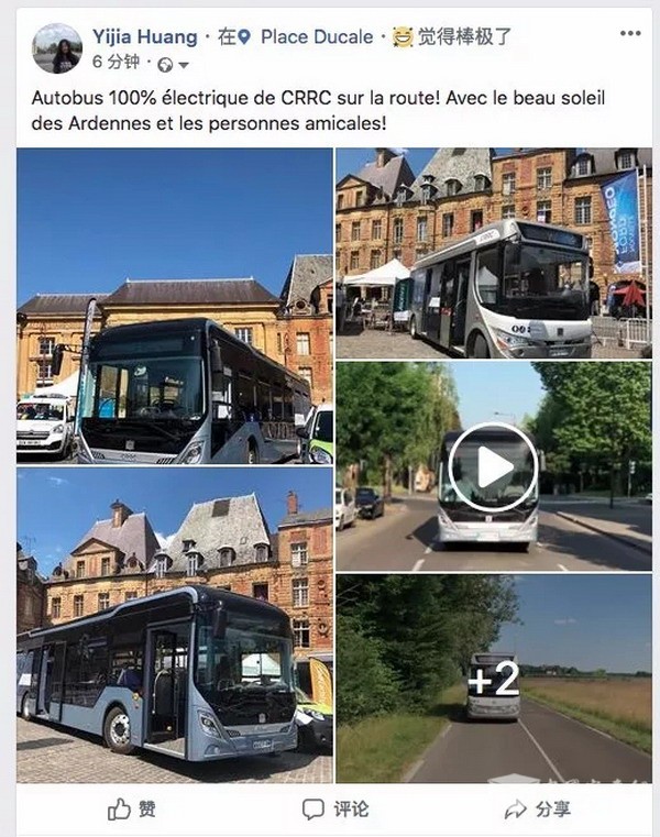 7月2日,一名中国留学生在法国,路遇“中国中车”纯电动巴士,如遇“姆巴佩”一样兴奋。