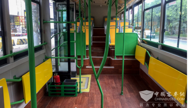车厢中部扶手杆好比树干,便于乘客抓扶。车厢内配以耐水、耐腐蚀的实木地板,可令车辆历久弥新,也更温馨。