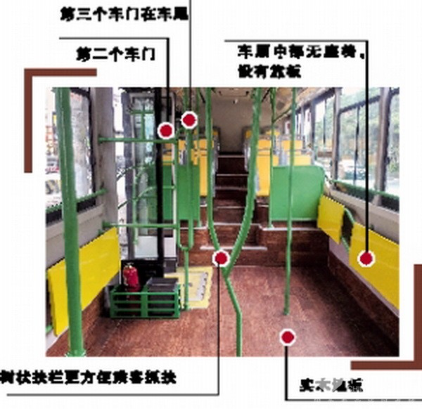 进入车厢,车内“别有洞天”:棕色实木地板温馨舒适,环保绿、柠檬黄是整车的主基调,位于车厢中部的绿色树状扶手让人眼前一亮。乘客无论身高高矮,都很容易抓扶,无需“踮脚”或“低头”。车厢中部类似机场摆渡车,采用无座椅设计并装有挡板,增加站立空间可以运载更多乘客。记者数了一下,车厢内共有18个座位。