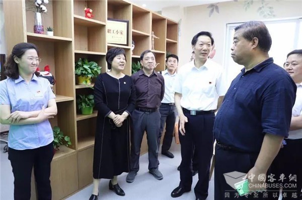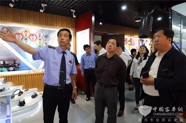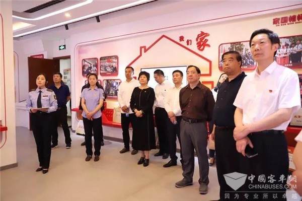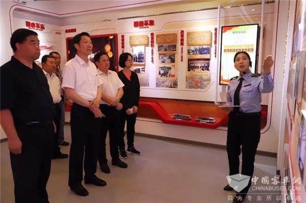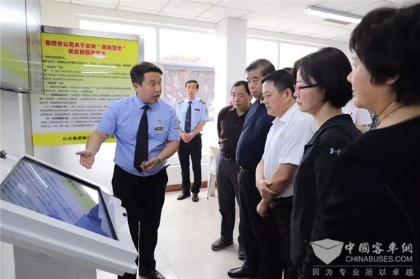 在客四分公司党委书记王金玲,1路车队管理人员的引领下,一行公交领导参观了1路“中国红”新能源纯电动车,调度室、职工心灵驿站、党员活动室、刘建辉技师工作室、充电桩,深入了解车厢文化、车辆使用性、班前智能教育系统、信息智能显示系统、综合智能调度系统、充电设施等信息化平台和企业文化展示平台。