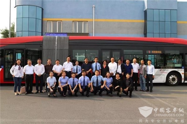 参观结束后,集团领导与洛阳公交集团领导在“中国红”新能源电动车前合影留念。