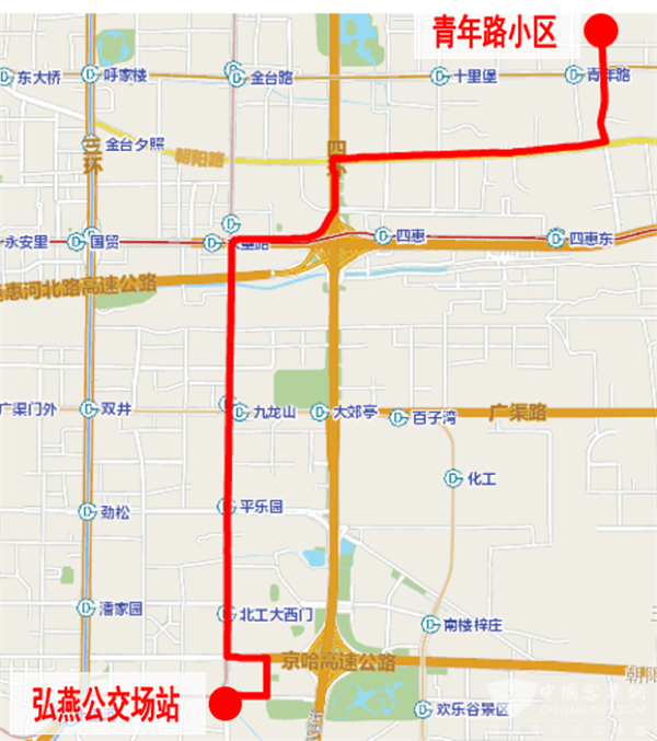 2.调整605路。因调整后的126路北段与现状605路路由相同,为减少线路并行重复,将605路调整引入青年路小区。调整后首末站:青年路小区-弘燕公交场站。由青年路小区发出,经四季星河西路至青年路小区南站,沿605路原路由至弘燕公交场站。增设站位:青年路小区、四惠桥西(青年路小区→弘燕公交场站)、北京东站北(弘燕公交场站→青年路小区)、四方桥西(弘燕公交场站→青年路小区);取消石各庄-黄杉木店沿途各站位。营业时间:青年路小区5:10-22:20,弘燕公交场站5:30-22:30。