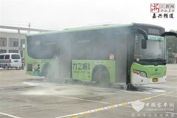 此外,现场还演练了当有人携带大量汽油点燃公交车时的情况。在大火和浓烟笼罩了整个车厢时,驾乘人员及时启动了客舱喷淋灭火系统,系统在1秒内开始工作,车厢内所有的喷头开始向车厢里无死角的喷射灭火剂。持续2分多钟的客舱喷淋,为车厢降温的同时也保护乘客不被烧着,为乘客赢得了最大的逃生时间,可以保证乘客安全有序撤离。