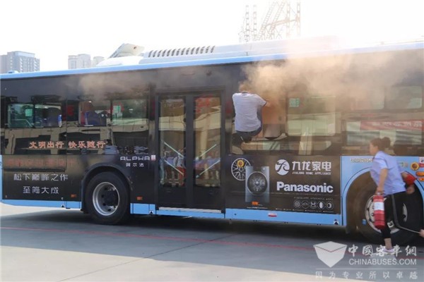 模拟公交车车厢突然起火,驾驶员迅速停车,打开车门疏散“乘客”撤离,在后门开启失效的情况下,利用后门外侧应急开关进行逃生。所有“乘客”及驾驶员安全疏散撤离到指定位置,用时最少的一组获胜。通过竞赛,四组参赛人员中最少的一组用时12.2秒。
