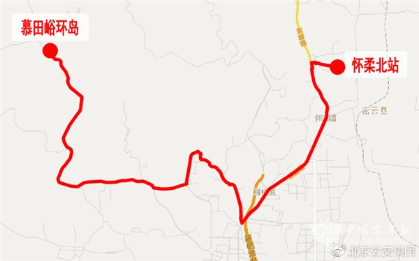 17.新开H82路。方便乘客通过城市铁路怀密线换乘前往雁栖湖、红螺寺、慕田峪等景区,接驳怀柔北火车站。首末站:怀柔北站-慕田峪环岛。中途设站:怀柔北站、雁栖湖、红螺寺、慕田峪环岛。营业时间:怀柔北站8:15、15:55;慕田峪环岛10:40、17:05。
