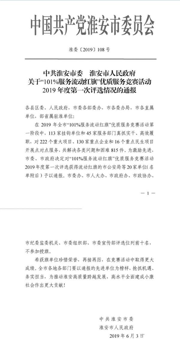 江苏:淮安公交公司被市委市政府授予2019年第一季度“101%服务流动红旗”
