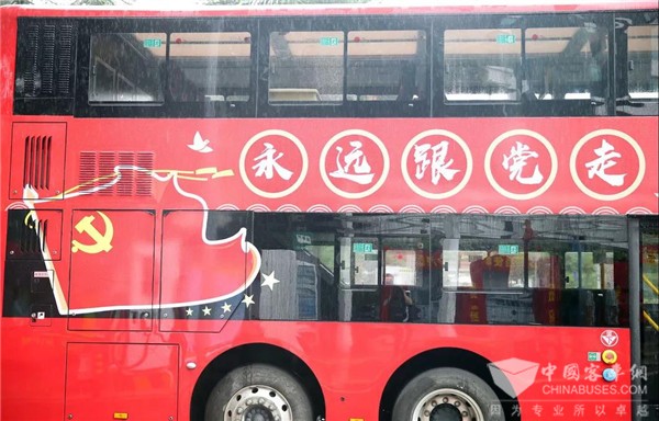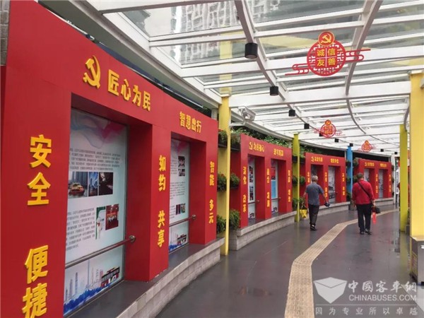这一天,珠江新城公交站场特别鲜艳夺目,站场党建展览区以金色和红色为主色调,将天安门、五星红旗、祥云与和平鸽等作为设计元素,紧紧围绕“不忘初心、牢记使命”的主题教育要求,多方位多层次展现企业多元化的经营业态。