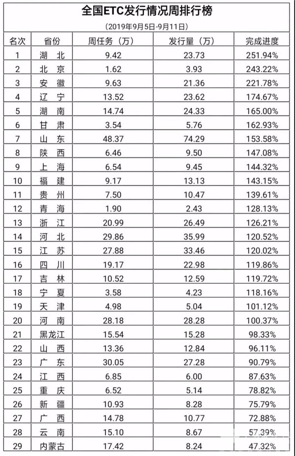29个联网收费省份中,有20个超额完成了周发行任务,完成进度位居前10名的省份依次是:湖北(251.94%)、北京(243.22%)、安徽(221.78%)、辽宁(174.67%)、湖南(165%)、甘肃(162.93%)、山东(153.58%)、陕西(147.08%)、上海(144.32%)和福建(143.15%);位居后10名的省份依次是:内蒙古(47.32%)、云南(57.39%)、广西(72.88%)、新疆(75.79%)、重庆(78.82%)、江西(87.63%)、广东(90.79%)、山西(96.11%)、黑龙江(98.33%)和河南(100.37%)。