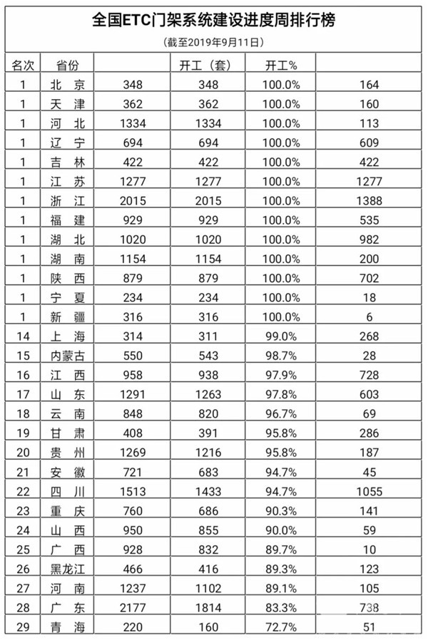 全国ETC门架系统建设新开工875套,占总计划的3.4%;完工2974套,占总计划的11.6%。截至9月11日,全国累计开工24447套,占总计划的95.5%;其中,已完工11072套,占总计划的43.3%。
