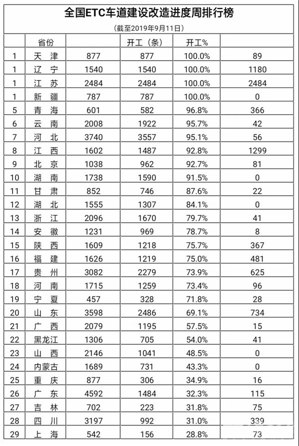 全国ETC车道建设改造新开工7863条,占总计划的15.3%;完工2580条,占总计划的5%。截至9月11日,全国累计开工36102条,占总计划的70.3%;其中,已完工8673条,占总计划的16.9%。