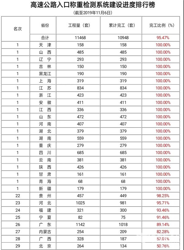 全国高速公路入口称重检测系统建设改造总计划为11468套。截至11月6日,累计完工10948套,占总计划的95.47%。