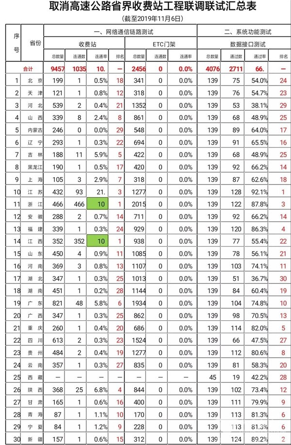 2019年11月1日至11月6日各地取消高速公路省界收费站重点工作进展情况,一起来看!