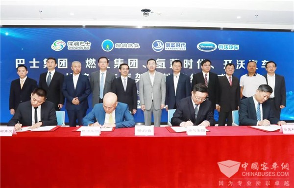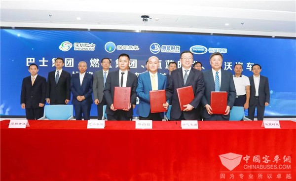 2019年11月13日上午,深圳巴士集团、燃气集团、氢蓝时代、开沃汽车四家企业在公交大厦签署了氢燃料电池汽车示范运营战略框架协议,合作研究氢燃料电池公交运营项目。