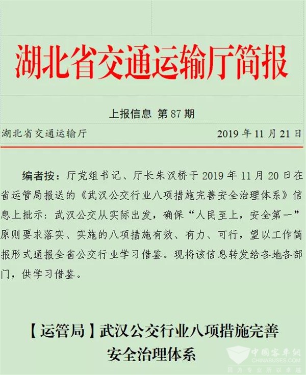 近日,湖北省交通运输厅编发简报,对武汉公交行业八项措施进行推广。厅党组书记、厅长朱汉桥在省运管局报送的《武汉公交行业八项措施完善安全治理体系》信息上批示:武汉公交从实际出发,确保“人民至上,安全第一”原则要求落实、实施的八项措施有效、有力、可行,望以工作简报形式通报全省公交行业学习借鉴。