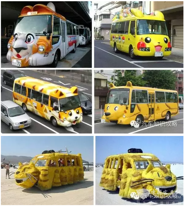 猫车源自日本动漫龙猫。这个巨大的生物是一只微笑着的雄猫,其空洞的身体其实是一辆公交车,上面有门窗和座椅。