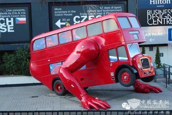 位于伦敦2012年建造的奥运总部旁边的伦敦助推器。这辆1957年建造的公交车有一双巨大的、充满肌肉的机械手。这玩意儿还能做俯卧撑。