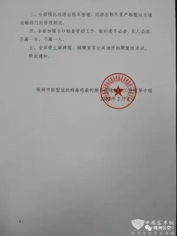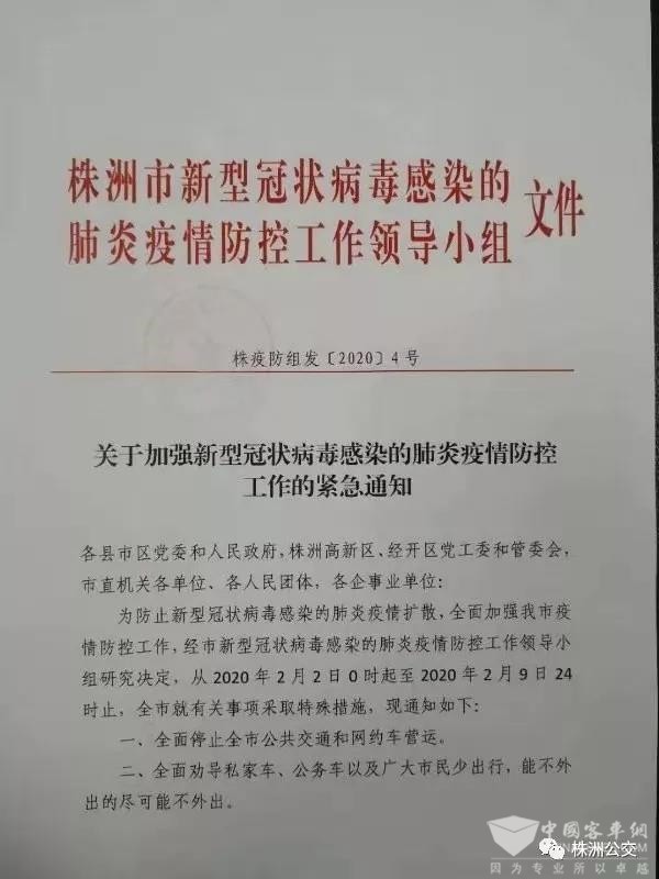 根据株洲市新型冠状病毒感染的肺炎疫情防控工作领导小组2020年2月1日下发的《关于加强新型冠状病毒感染的肺炎疫情防控工作的紧急通知》(株疫防组发〔2020〕4号)文件要求,为防止新型冠状病毒感染的肺炎疫情扩散,全面加强我市疫情防控工作,从2020年2月2日0时起至2020年2月9日24时止,全面停止全市公共交通营运。