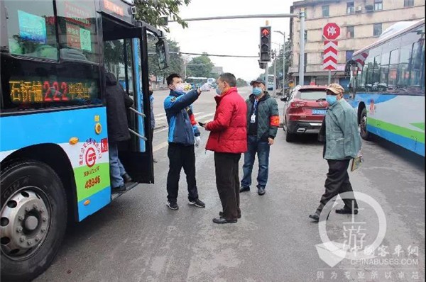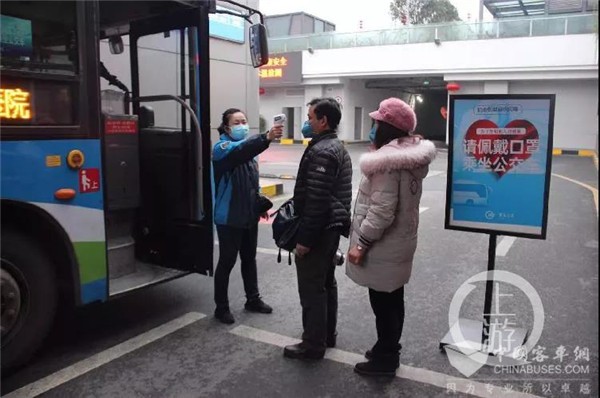 2020年2月4日早上7点,重庆西站党员突击队队员李麒手拿体温检测仪在213站台为车长、乘客测量体温,文明劝导乘客戴口罩乘坐公交车,其他党员突击队队员在多个公交车站、站点服务。