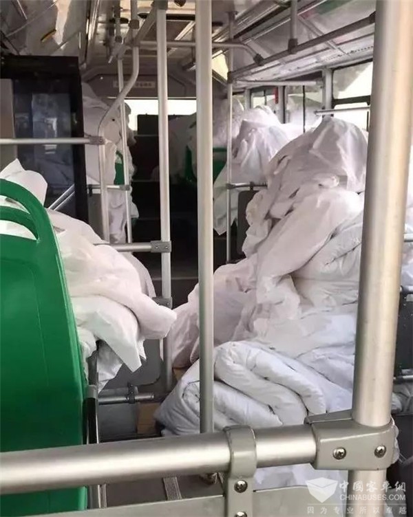 2月3日晚,武汉市分别在洪山体育馆、武汉客厅、武汉国际会展中心连夜建设三所共计2800个床位的“方舱医院”,专门收治轻症患者。晚上8点,接到防疫物资转运的任务,公交二公司立即派出四台公交车驰援武汉国际会展中心,专门负责接送现场工作人员、志愿服务者及床铺、床上用品和电热毯等防疫物资。