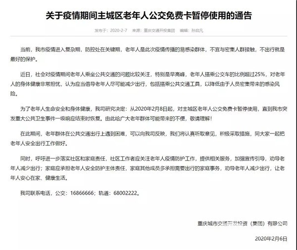 2020年2月7日,重庆城市交通开发投资(集团)有限公司发布通告,决定从2月8日起,主城区老年人公交免费卡暂停使用,直至重庆市突发重大公共卫生事件一级响应结束时恢复。