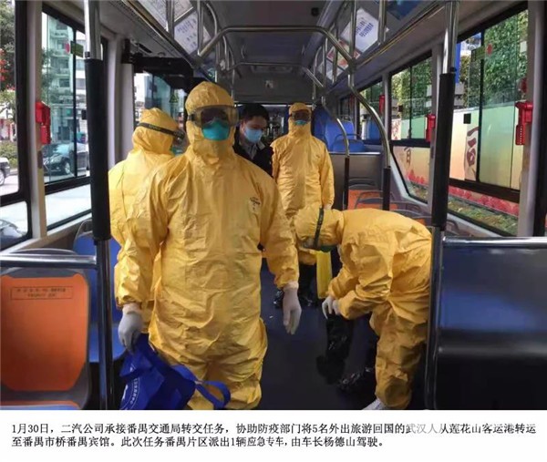 1月30日,二汽公司承接番禺交通局转交任务,派出1辆应急运输专车,协助防疫部门将5名外出旅游回国的武汉人转运至指定地点;
