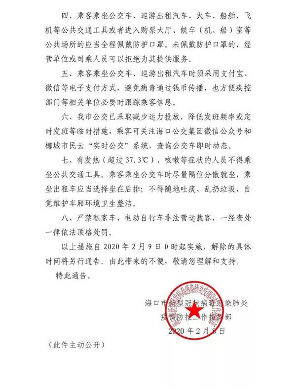 2020年2月8日,海口市新型冠状病毒感染肺炎疫情防控工作指挥部发布通告,宣布自2020年2月9日0时起海口采取八项措施加强公共交通运行管理,这些措施解除的时间将另行通告。
