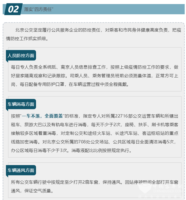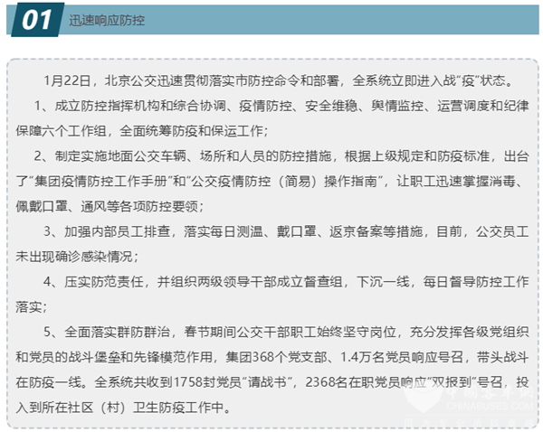 北京疫情防控工作启动以来,北京公交集团作为首都地面公交运行主体和国有大型公益性企业,在市防疫领导小组交通保障组的坚强领导下,坚决贯彻落实中央防控要求,始终把人民群众生命安全和身体健康放在第一位,把疫情防控工作作为当前最重要的任务来抓,坚决贯彻落实市委市政府和市交通委、市国资委的工作部署,严格落实“外防输入,内防扩散”的防控措施,牢牢把握“坚决防止公共交通工具传播,坚决防止内部员工大规模感染,坚决防止企业人员漏管失管,坚决保障地面公交安全运行”四个重点,全面打好防疫阻击战,保障首都城市交通安全有序运转。
