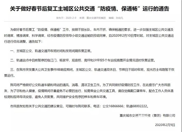 2020年2月9日,重庆城市交通开发投资(集团)有限公司发布通告,自2月10日起,对主城区公共交通运行进行优化调整。