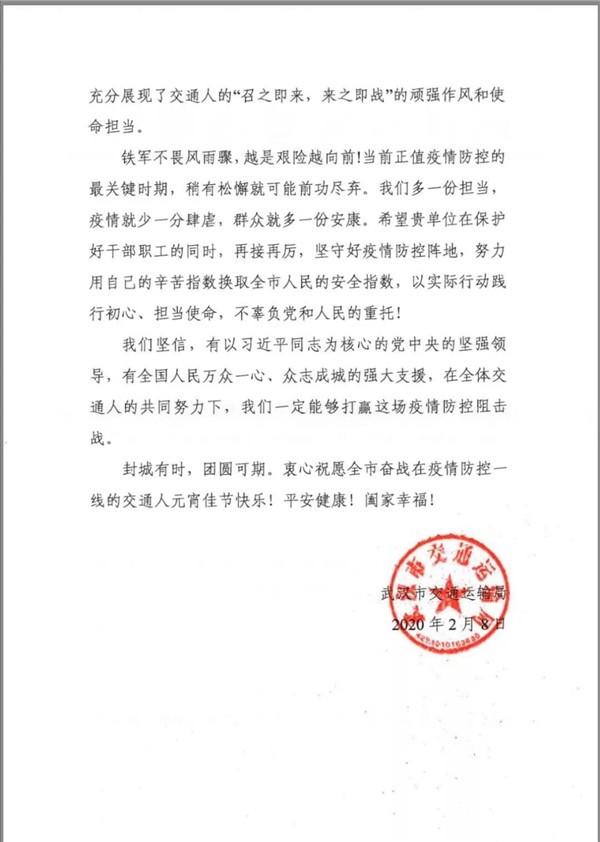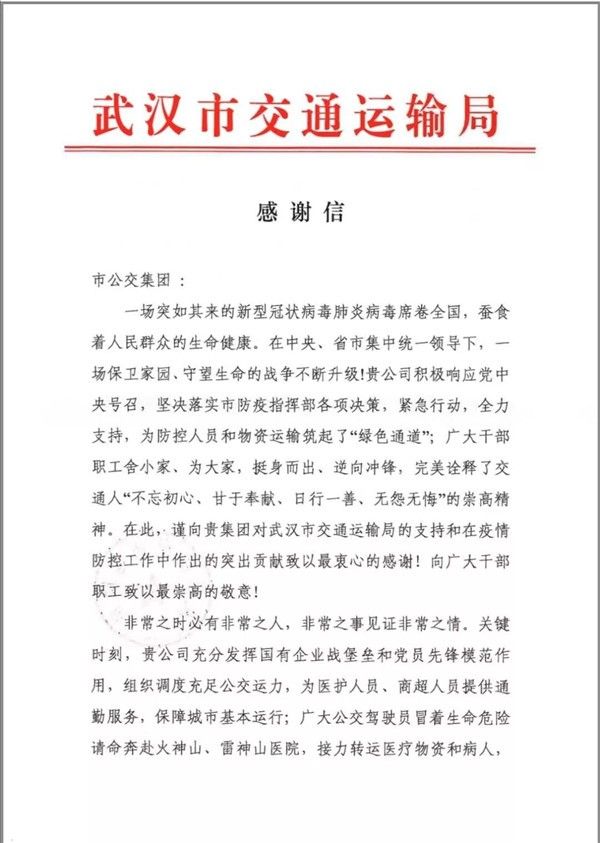 武汉市交通运输局致信感谢武汉公交集团