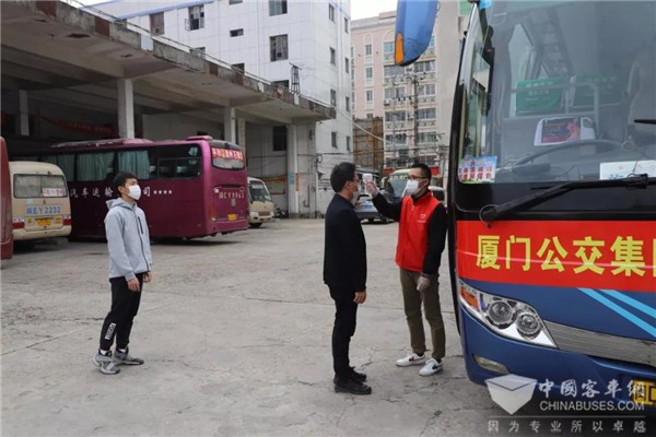 2020年2月11日上午7时首批4辆免费“点对点”包车返厦大巴从厦门湖滨南路BRT停车场出发分别前往平和、武平等4县客运站,组织外地务工人员包车当天返回厦门,并将员工送到所属企业,厦门公交集团旗下的交通国旅公司承接了本次的接送任务。