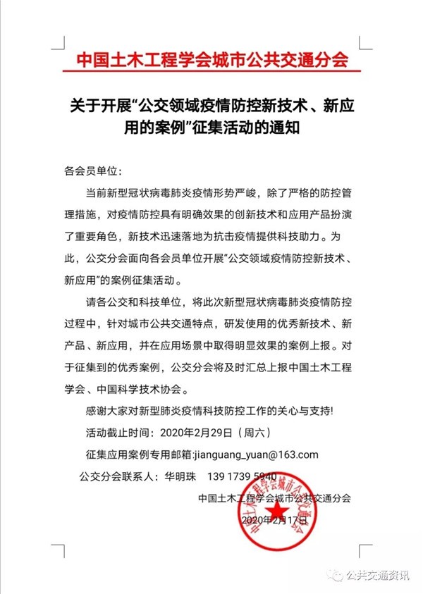 请各公交和科技单位,将此次新型冠状病毒肺炎疫情防控过程中,针对城市公共交通特点,研发使用的优秀新技术、新产品、新应用,并在应用场景中取得明显效果的案例上报。对于征集到的优秀案例,公交分会将及时汇总上报中国土木工程学会、中国科学技术协会。