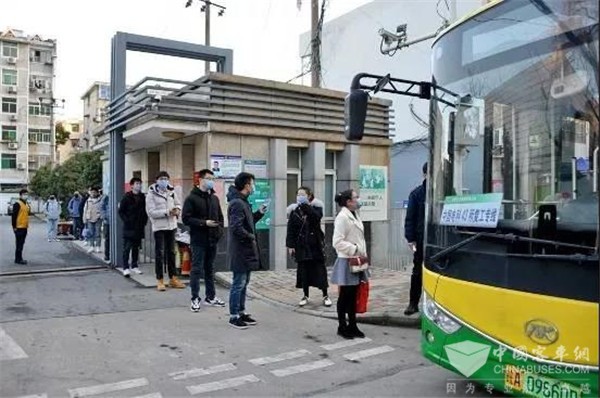 2月17日8:10,安徽互信金服的20余名职工在经开区紫蓬路排队乘坐公交集团“安徽互信金服复工通勤专线”车辆。