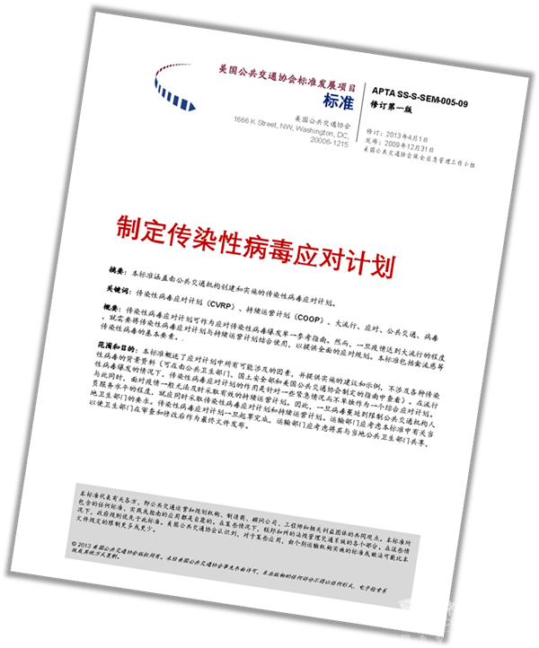 2009年,美国公共交通协会(APTA)发布行业标准《制定传染性病毒应对计划》(APTA SS-S-SEM-005-09),2013年又进行了修订,这一行业标准是专门针对传染性病毒大流行而制定的应对计划,它的基本框架是根据世界卫生组织划分传染性病毒大流行阶段连续性曲线的四阶段(消退期、警戒期、大流行期和过渡期)和六警戒级别,按照《国际卫生条例(2005)》分别采取不同应对措施,包括启动特定行动的警戒级别;利用信息和教育计划与应急管理部门、员工和公众进行沟通;采取必要的消毒程序有效限制病毒传播;为公共交通从业人员提供额外保护的卫生援助;以及为必要的公共交通从业人员提供疫苗或抗病毒药物等内容;最重要的是公共运输机构要与政府有关部门协作,根据疫情减少、停止和恢复公共交通服务,保障城市的基本出行服务。
