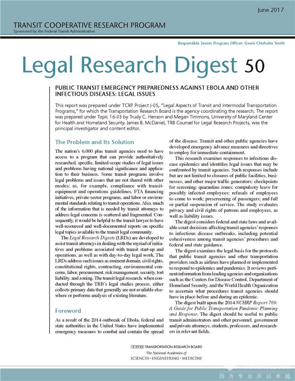 2014年西非埃博拉病毒的爆发,美国联邦和州政府采取紧急措施来对抗和控制疫情的传播,联邦公共交通管理局(FTA)赞助公共交通协作研究项目《公共交通和多式联运的法律问题》(TCRP-J-05, Legal Aspects of Transit and Intermodal Transportation Programs),涉及环境标准和要求、建设与采购合同流程和管理、公民权和劳工标准、民事责任与风险管理和系统安全四个领域,研究项目由交通运输研究委员会(TRB)协调。2017年在《法律研究摘要》上发布研究报告《应对埃博拉等传染病的公共交通应急准备:法律问题》(Public Transit Emergency Preparedness Against Ebola and Other Infectious Diseases: Legal Issues),进一步阐述传染性病毒有关的各种倡议和问题以及日常法律工作,例如关闭主要交通发生点、全面或部分暂停服务、潜在病毒携带乘客的筛查和预筛查、公共卫生检疫和隔离、员工保护和工作安全、传染控制和消毒措施等。