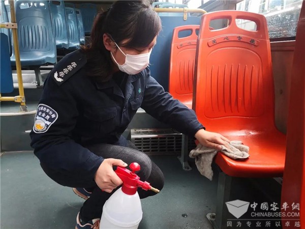 太湖花园营运部在车厢内张贴乘坐公交车温馨提醒,党员分组对车辆进行清洁和消毒。
