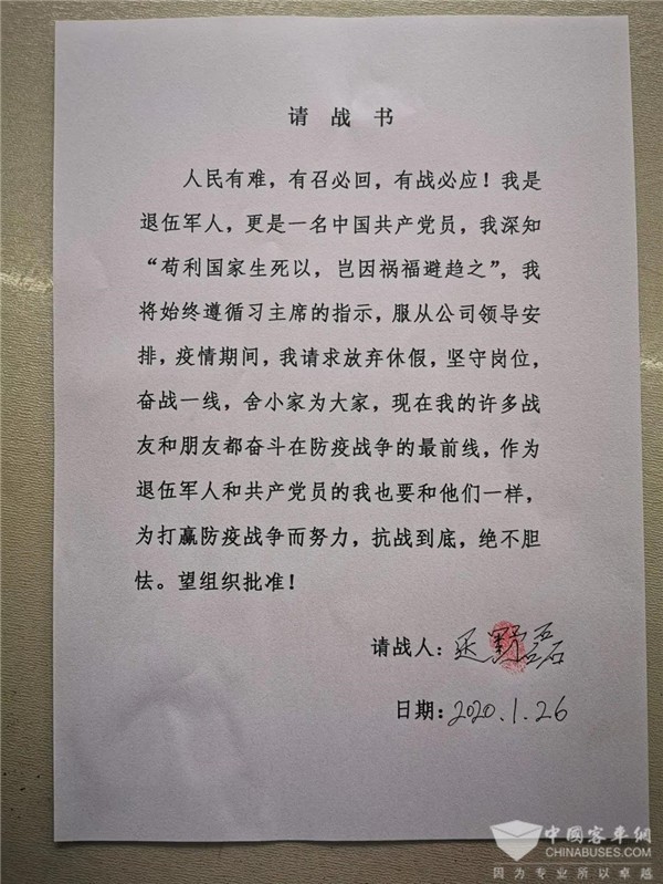 ——“人民有难,有召必回,有战必应!我是退伍军人,更是一名中国共产党员,我要坚守岗位,奋战一线,舍小家为大家,现在我的许多战友和朋友都奋斗在防疫战争的最前线,作为退伍军人和共产党员的我也要和他们一样,为打赢防疫战争而努力,抗战到底,绝不胆怯”。这是367路驾驶员迟野磊的请战书,虽寥寥几句话却承载了一名退伍军人的使命与担当。“疫情当前,党员靠前。”自疫情发生后,迟野磊始终坚守疫情防控一线,主动承担起防疫知识宣传、群众思想动员、口罩导购、使用后口罩处理指南、车厢喷药消毒预防等工作,还积极动员党小组成员以及班组成员参与到防疫工作中来。——314路驾驶员郝鑫自2016年从部队退役后便来到公交集团,从事公交驾驶员工作。春节前夕,这位“准爸爸”正沉浸在拥有一对双胞胎的喜悦之中,计划着调休几天,能多多陪伴妻子和孩子们。得知疫情突发后,郝鑫顾不上住院生产的妻子,便随同事们一起加入到紧张的抗疫工作中来。公交驾驶员每天接触的人多,工作环境相对风险较大,郝鑫每天抽出时间到病房外隔着玻璃看看妻子和孩子,把叮嘱和担心记录在小纸条上,等自己离开后让家人转交给妻子,转眼孩子们已经满月,这位父亲还一次都没有摘下口罩跟孩子们亲近过。