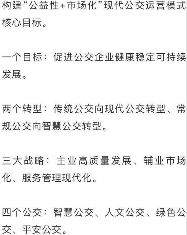 积极构建“公益性+市场化”现代公交运营模式,通过落实“主业高质量发展、辅业市场化、服务管理现代化”三大战略,促进企业由传统公交向现代公交转型、常规公交向智慧公交转型,推动企业健康稳定可持续发展。