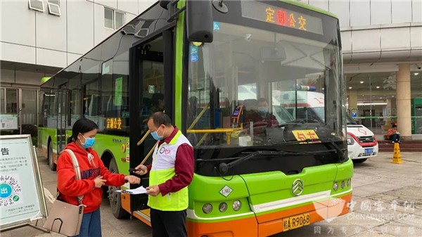 西乡塘车队对广西医科大学定制公交化出行服务特别重视,派出志愿者做好乘车人员的体温检测和疫情防控工作。