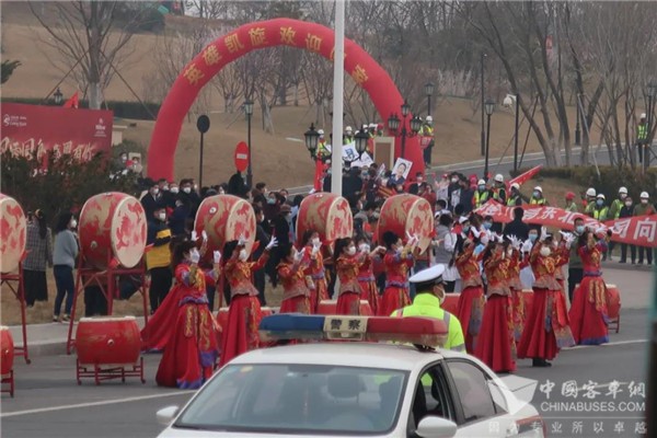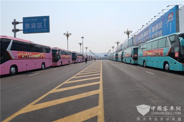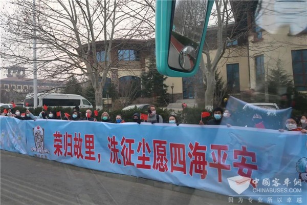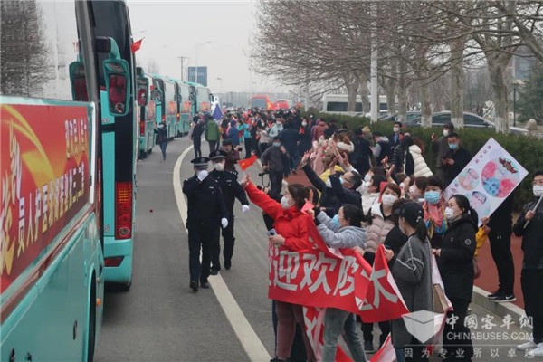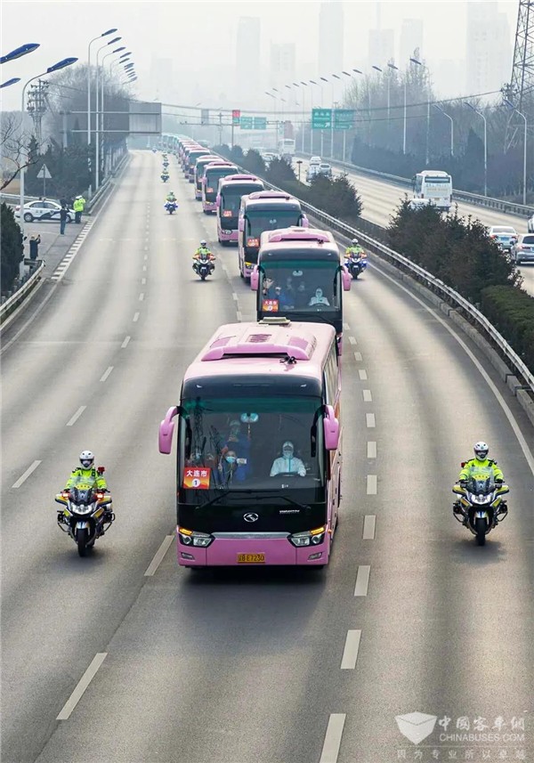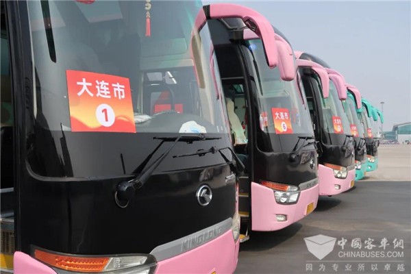 候机坪上,奔驰中心的11台粉色、13台绿色金龙大客车和3台金属黄色考斯特中巴车格外显眼。车头和车尾玻璃窗上分别粘贴了车辆编号,车身两侧 “大连人民欢迎第二、三批驰援湖北医护人员凯旋”的标语在阳光下闪耀,整齐有序排列的运输车队引得各路摄影记者纷纷举起摄像机、照相机……