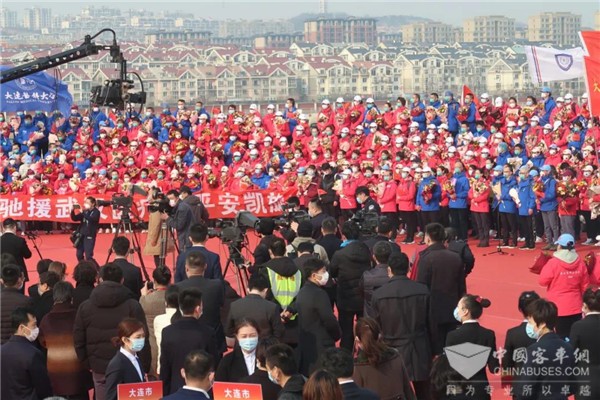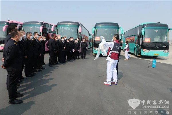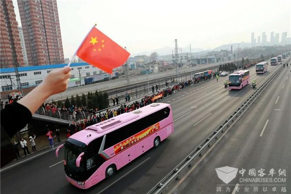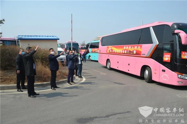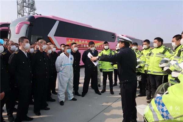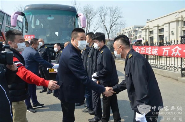 大连公交集团3月26日接到上级通知:准备24台金龙大客车和3台考斯特中巴车,到大连周水子国际机场迎接英雄回家,并把他们护送到金石滩的两家酒店接受14天的隔离休养。公交集团领导高度重视,安排汽车六分公司奔驰客运服务中心(以下简称奔驰中心)完成这项光荣而艰巨的任务。汽车六分公司经理(党委书记)蓝军亲自安排部署,领导班子其他成员也到奔驰中心现场督促落实。奔驰中心接到任务后,全体干部职工都激动无比。党员、干部和驾驶员都踊跃报名参加这次光荣的任务。最终,奔驰中心挑选出27台车况好的金龙大客车和考斯特中巴车,选派出27名驾驶技术优良的驾驶员,由主任樊有良、运营科长孙强、车队长晏成带队组成运输分队。