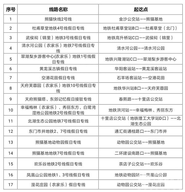 2020年4月4日起,成都公交集团将开行17条假日专线,方便市民及游客前往熊猫基地、杜甫草堂、武侯祠(锦里)、清水河公园、翠湖梨乡、黄龙溪古镇、空港花田、天府芙蓉园、天府熊猫塔、东郊记忆、幸福梅林、秀丽东方、白鹭湾湿地公园、北湖生态公园、东门市井、动物园、欢乐谷、凤凰山公园、漫花庄园等景点,加快建设美丽宜居公园城市,助力成都国际消费中心城市,打造“三城三都城”城市品牌贡献更多公交力量。